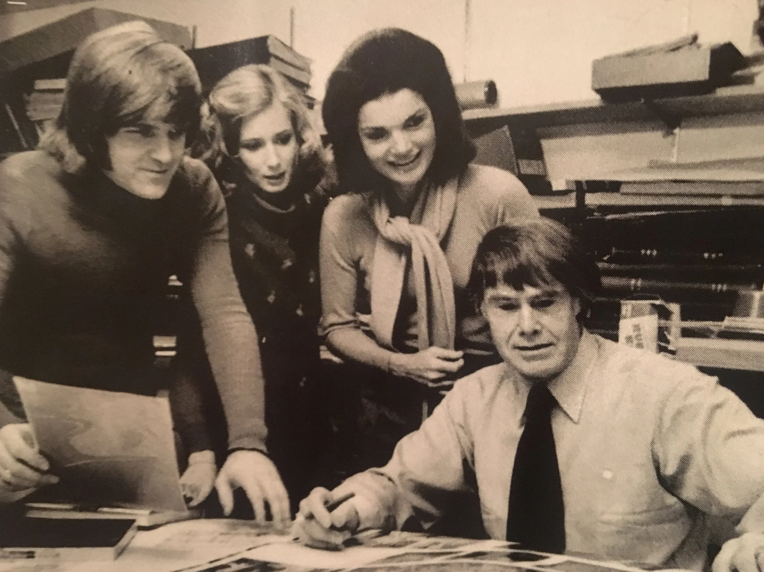 Above, from left: Christopher Holme, Towey, Jacqueline Kennedy Onassis, and Bryan Holme at work on Onassis’ book, In the Russian Style, at the Viking Press in New York, ca. 1977.