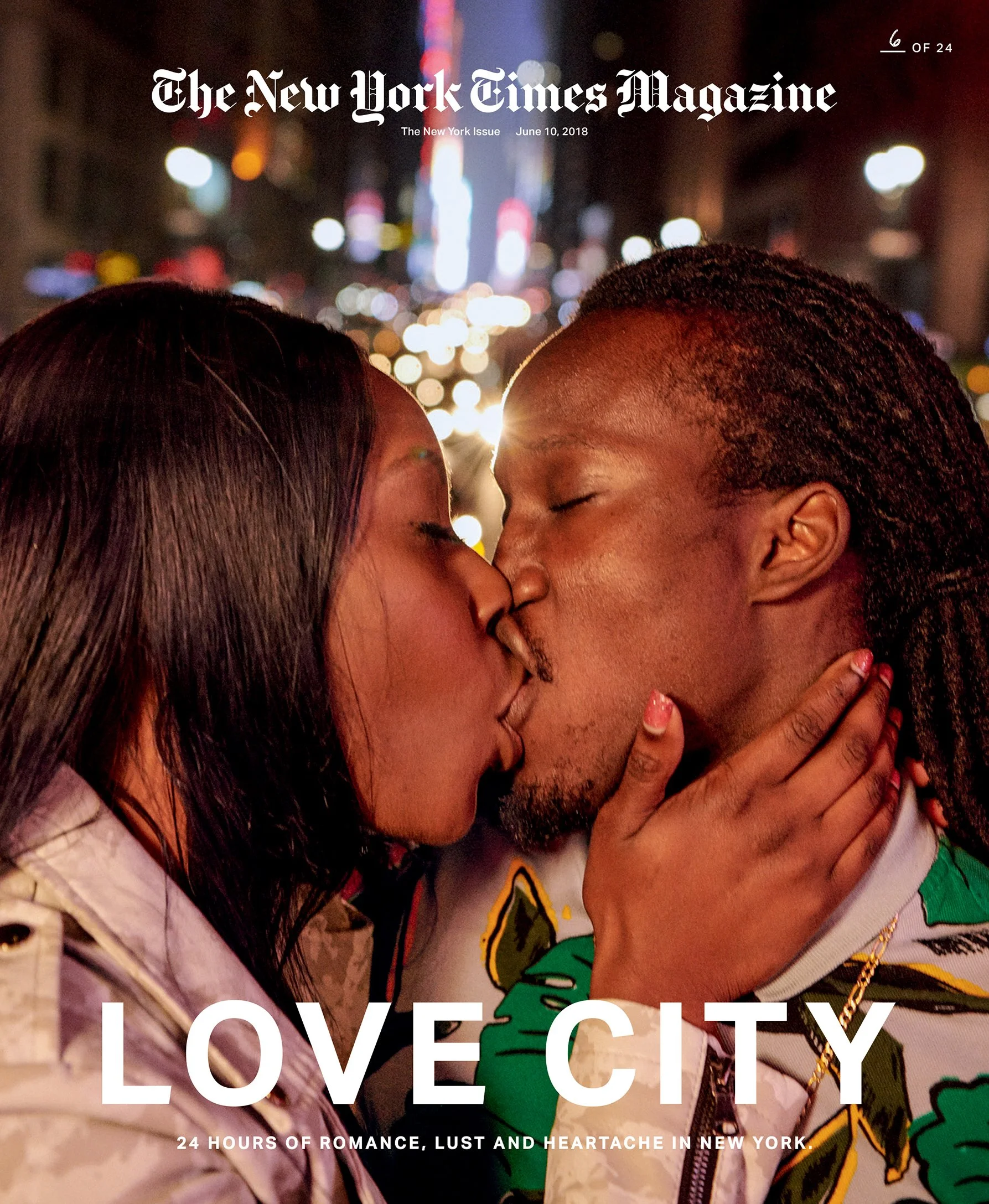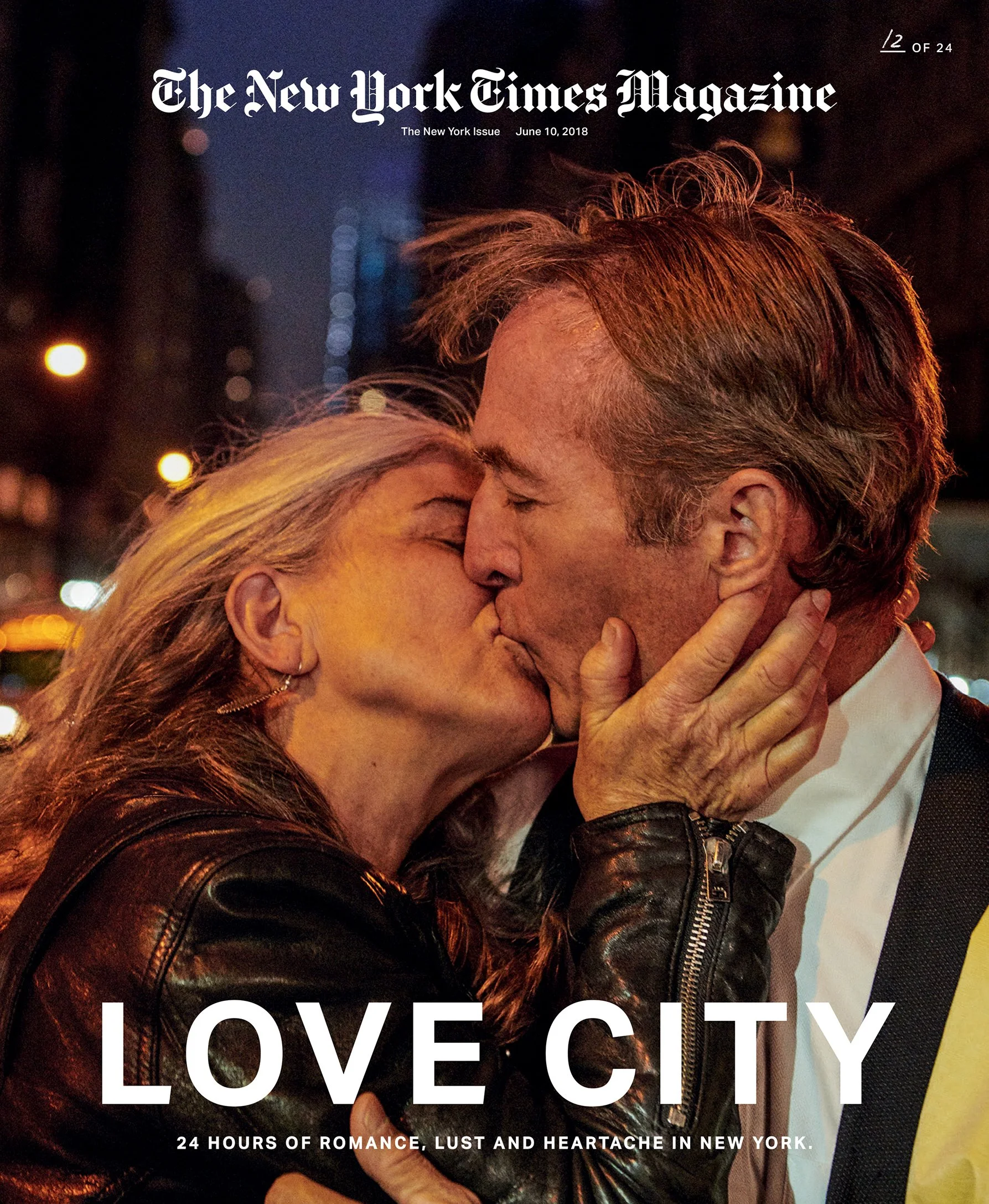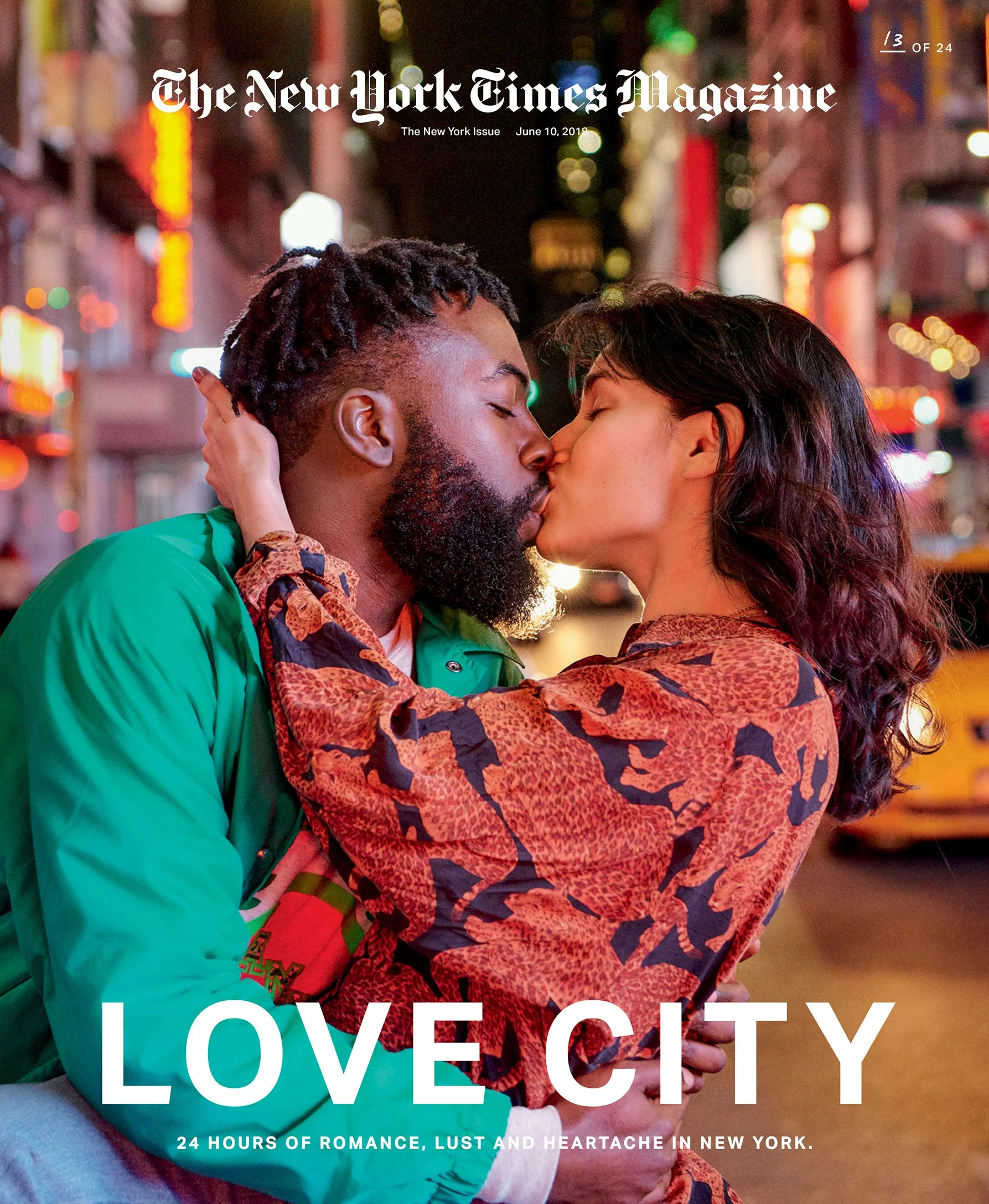 “Love City” was a special issue of The New York Times Magazine dedicated entirely to love in New York City over the course of a single day: Saturday, May 19, 2018. All the photography was shot on that date between 12 a.m. and 11:59 p.m. By choosing this theme and so tightly limiting the time frame, the magazine hoped to convey the city’s magical density of intimacies, the way it juxtaposes the private communion of one pair of lovers with the rollicking public energy of the bustling crowd—itself composed of numberless lovers communing privately amid the noise, all the center of their own universe.