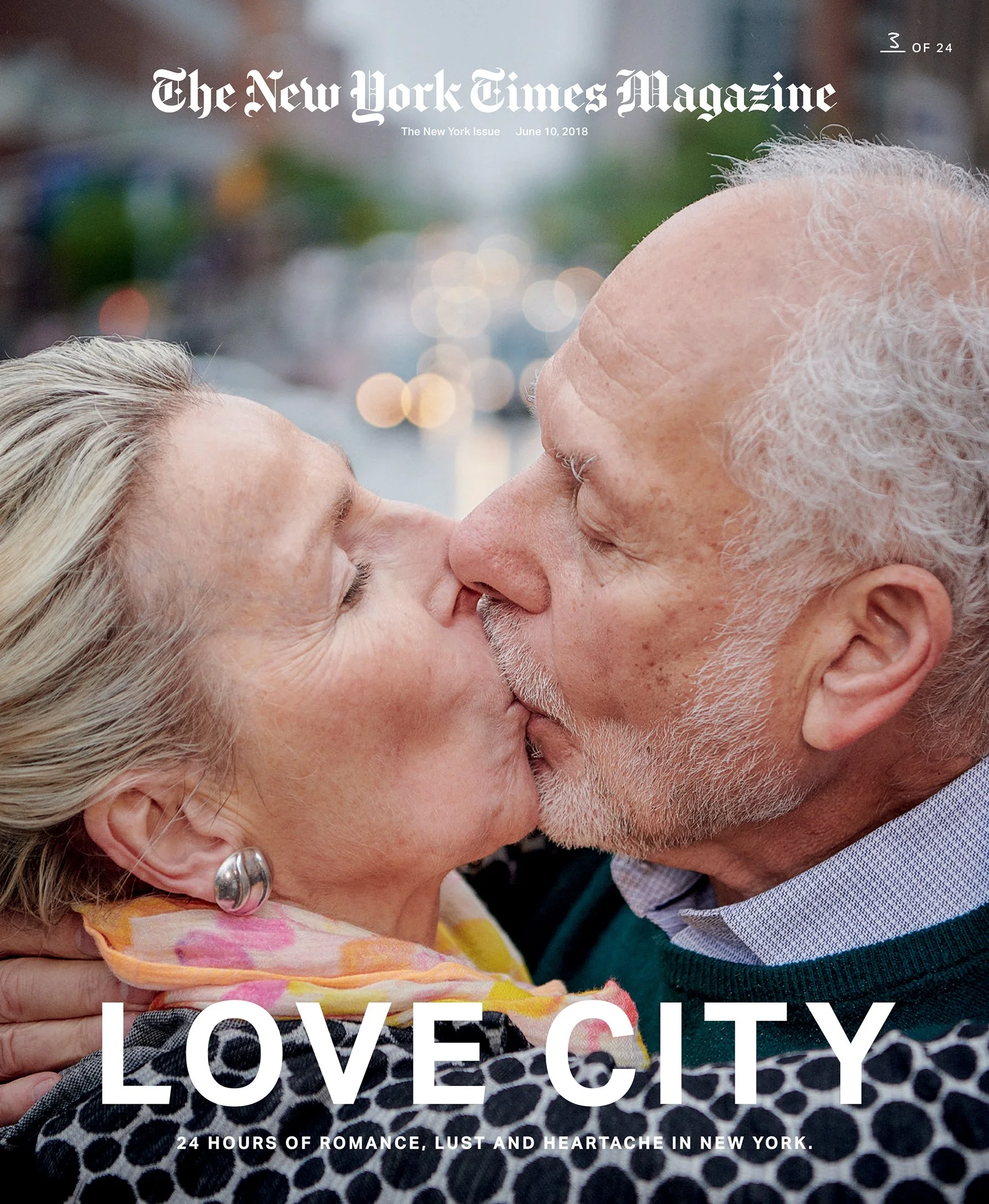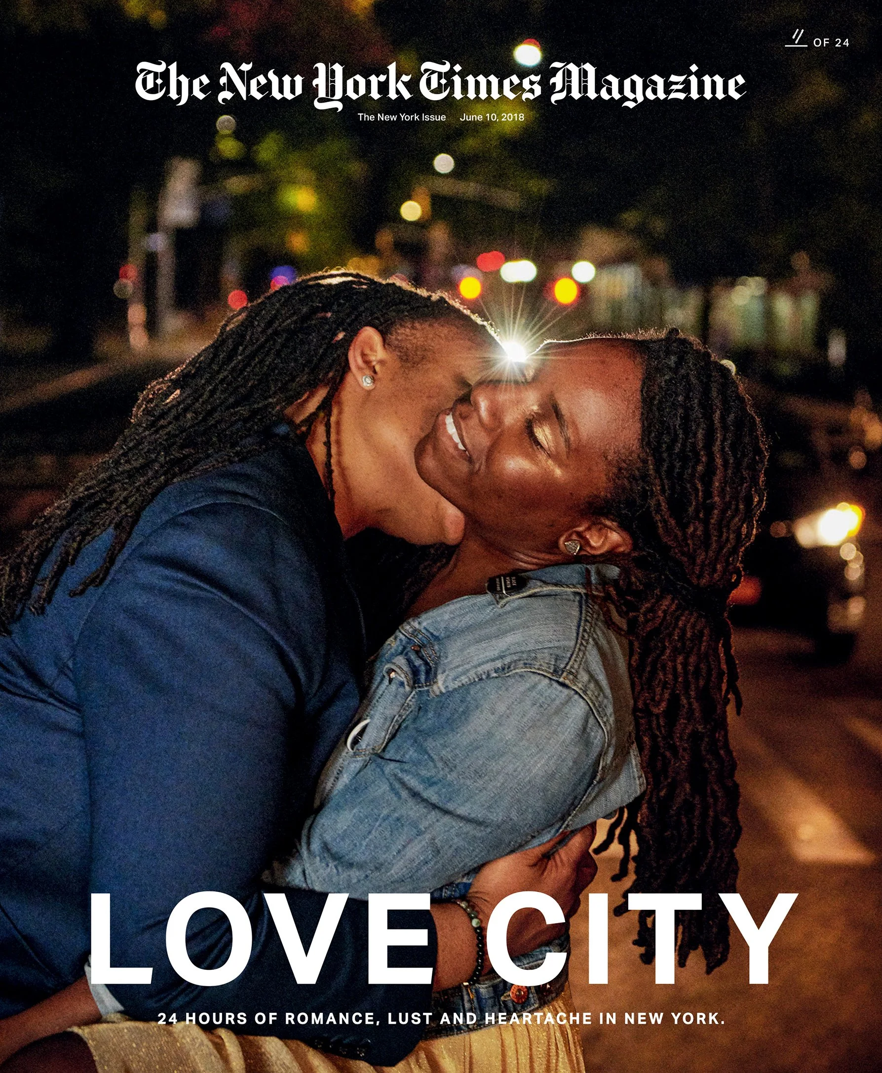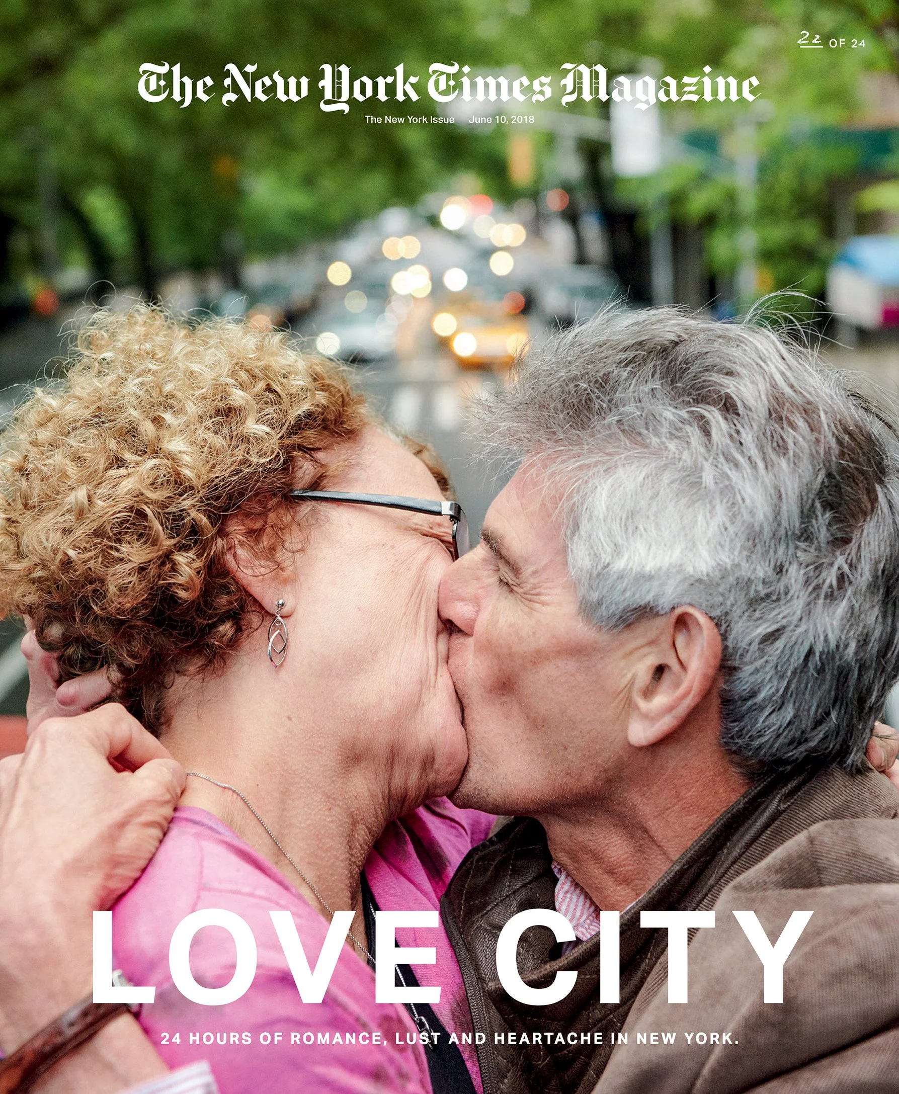 “Love City” was a special issue of The New York Times Magazine dedicated entirely to love in New York City over the course of a single day: Saturday, May 19, 2018. All the photography was shot on that date between 12 a.m. and 11:59 p.m. By choosing this theme and so tightly limiting the time frame, the magazine hoped to convey the city’s magical density of intimacies, the way it juxtaposes the private communion of one pair of lovers with the rollicking public energy of the bustling crowd—itself composed of numberless lovers communing privately amid the noise, all the center of their own universe.